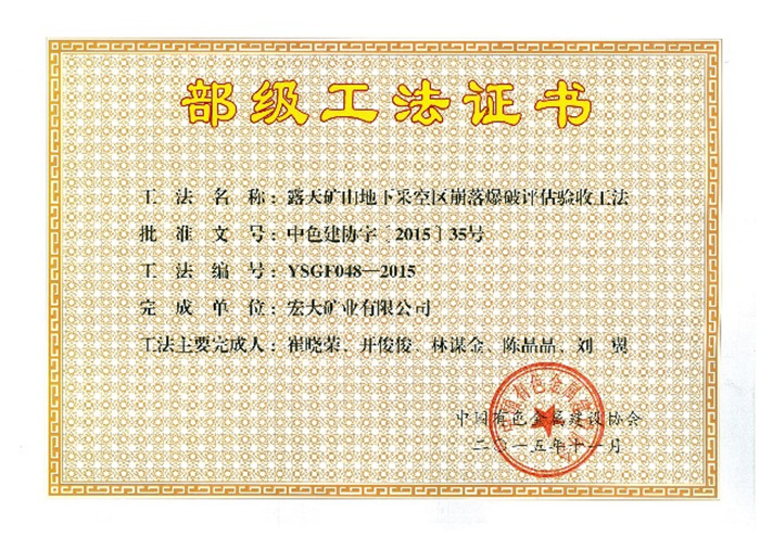 ¹ã¶«×ðÁú¿¹ÙÍøÈë¿Ú±¬ÆÆ¹É·ÝÓÐÏÞ¹«Ë¾È«×Ê×Ó¹«Ë¾£º×ðÁú¿¹ÙÍøÈë¿Ú¿óÒµÓÐÏÞ¹«Ë¾É걨µÄ¡¶µØ²Éת¶²É¿óɽ²É¿ÕÇø¿ÕÇøÖÎÀíÒþ»¼×ÊÔ´¿ª²ÉÐͬ×÷Òµ¹¤·¨¡·¡¢¡¶¸ßº®µØÇøÂ¶Ìì²É¿ó¹¤·¨¡·¡¢¡¶¸ßλðÇøÈ«¿×ÐîË®±¬ÆÆ¹¤·¨¡·¡¢¡¶Â¶Ìì¿óÖÇÄÜÉè¼Æ±¬ÆÆ¹¤·¨¡·¡¢¡¶»ùÓÚÏÖ³¡»ì×°µÄ¾àÀë×°Ò©Ô¤Áѱ¬ÆÆ¹¤·¨¡·¡¢¡¶Â¶Ìì¿óɽµØÏ²ɿÕÇø±ÀÂä±¬ÆÆÆÀ¹ÀÑéÊÕ¹¤·¨¡·ÁùÏ·¨Ë³Ëìͨ¹ýÖйúÓÐÉ«½ðÊô½¨Éèлáר¼ÒÆÀÉ󣬲¢ÓÚ¿ËÈÕ»ñµÃÖ¤Êé¡£ ´ËÏîЧ¹ûµÄ»ñµÃÊǶÔÎÒ¹«...